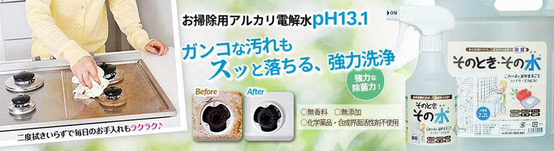 強力な洗浄力pH13.1のお掃除用アルカリ電解水「そのとき・その水」。