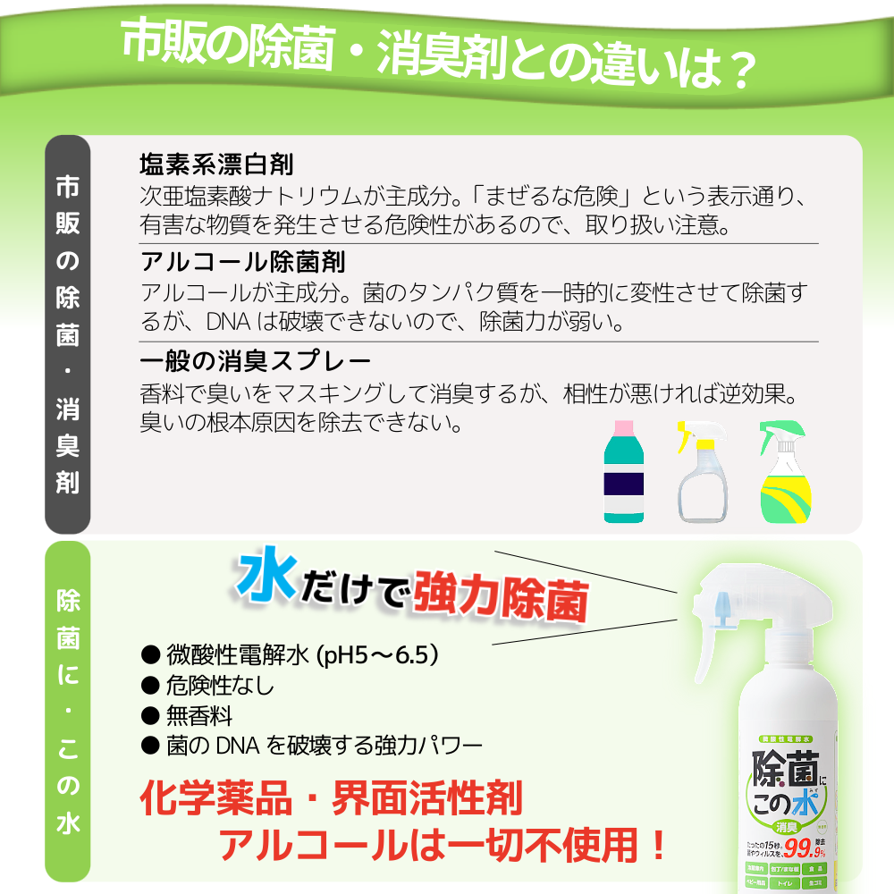 微酸性電解水(=微酸性次亜塩素酸水)は厚生労働省が食品添加物の殺菌剤にも指定しており、一般的な塩素系・アルコール系除菌消臭剤よりも高い安全性を持っています。