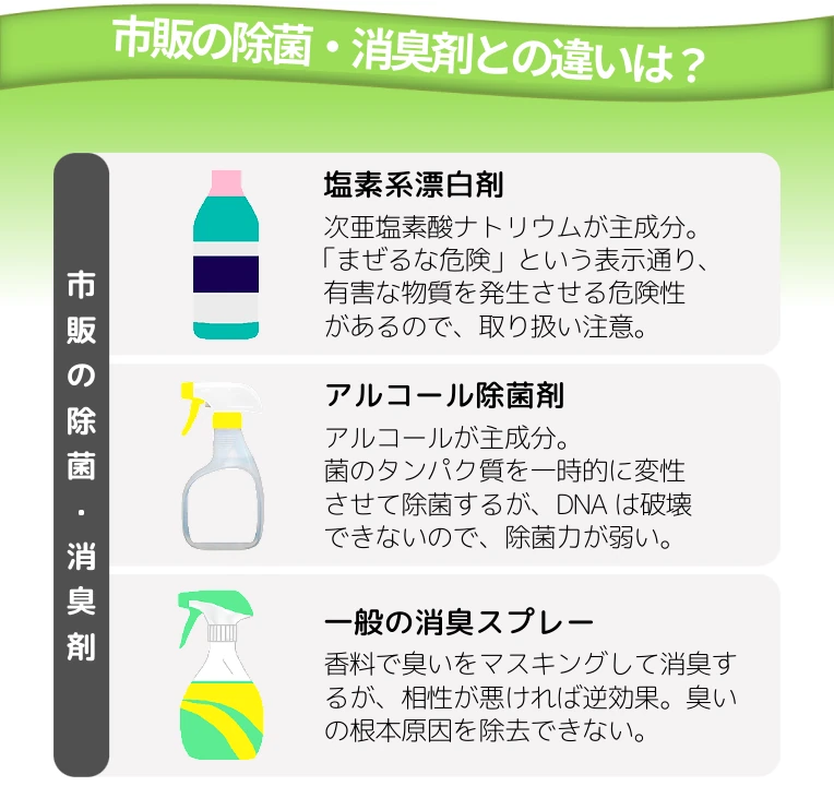 - 除菌したい所やニオイの気になる所に直接噴霧して下さい。噴霧後15秒で除菌できます。